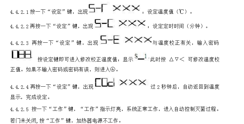 4.4.1開啟電源開關(guān)接通電源,數(shù)顯控制儀顯示。此時可開始設(shè)定溫度和滅菌時間。 4.4.2設(shè)定方法: